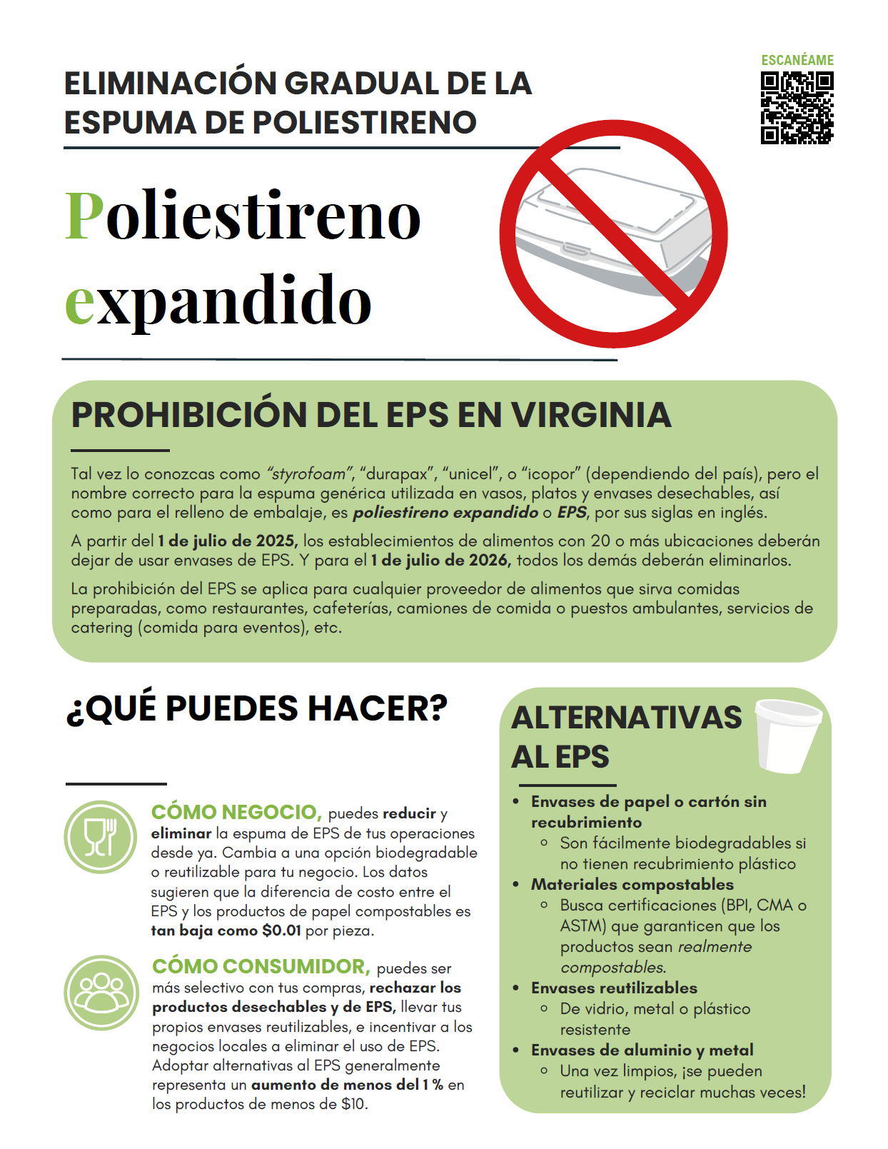 Originally, the ban was set to go into effect July 1, 2023 (for chains) and 2025 (for all), but this timeline was significantly delayed through 2022 budget amendments. In 2024, the General Assembly passed a bipartisan budget which accelerated the ban closer to its original timeline. Virginia’s EPS ban in food service is in effect as of July 1, 2025 (for chains) and will apply to all food establishments on July 1, 2026.